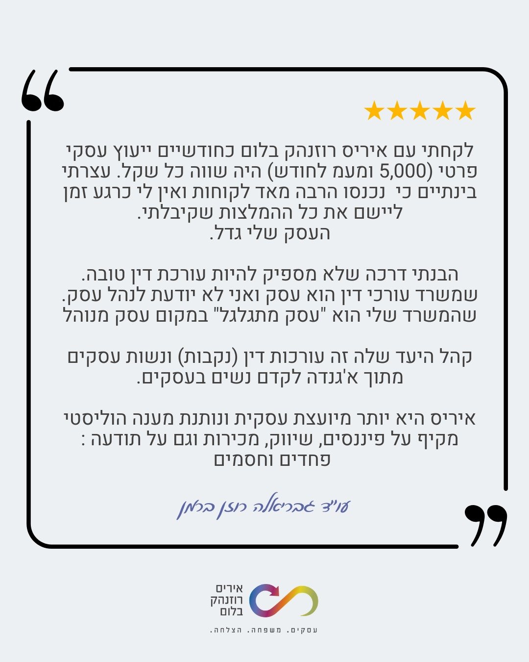 אני יועצת ומאמנת עסקית עם ניסיון עשיר, שמלווה בעלות עסקים מתחום עריכת הדין. אני לא רק נותנת ייעוץ עסקי ופיננסי – אלא מספקת מעטפת שלמה שמכסה שיווק, מכירות, פיננסים, תודעה ומערכות יחסים. בין אם מדובר בליווי מקיף של כמה חודשים או במסלול ממוקד לניהול פיננסי ושיווקי, אני עוזרת לבעלות עסקים לקחת שליטה, להגדיל רווחים ולבנות עסק שעובד חכם יותר.